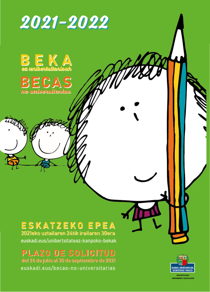Hasta el 30 de septiembre está abierto el plazo de solicitud de las Becas no universitarias del Gobierno Vasco. Pincha en los siguientes enlaces para acceder a toda la información necesaria para solicitarla. Irailaren 30era arte zabalik dago Eusko Jaurlaritzaren unibertsitatez kanpoko bekak eskatzeko epea. Sakatu esteka hauek, eskatzeko behar den informazio guztia eskuratzeko.