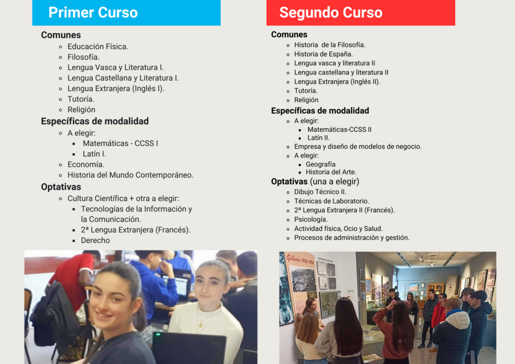 El Bachillerato General ofrece una amplia gama de opciones en cuanto a grados universitarios dentro del ámbito social. Asimismo, enfatiza la preparación para acceder a grados superiores de Formación Profesional como Administración y Finanzas, Marketing y Publicidad, Integración Social, Informática y Tecnologías de la Información, entre otros.